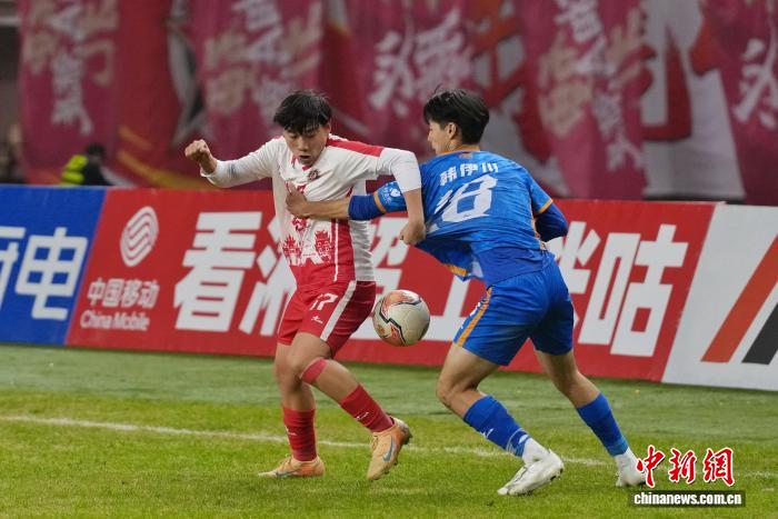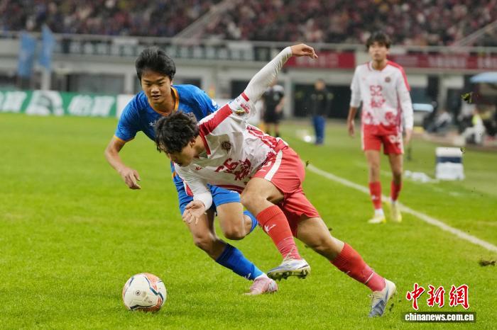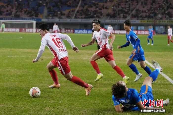 12月14日晚,2025湖南省足球聯(lián)賽淘汰賽四分之一決賽在長(zhǎng)沙進(jìn)行,長(zhǎng)沙隊(duì)主場(chǎng)2:0擊敗岳陽(yáng)隊(duì),成功晉級(jí)四強(qiáng)。圖為長(zhǎng)沙隊(duì)員王博(左一)過(guò)人。中新社記者 楊華峰 攝