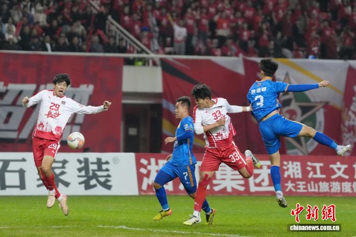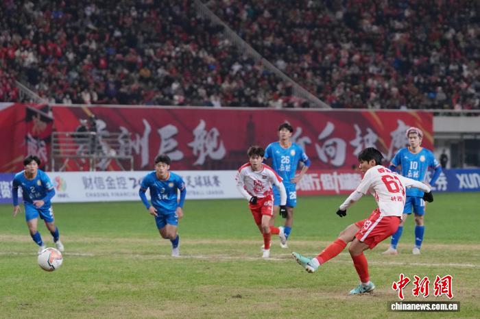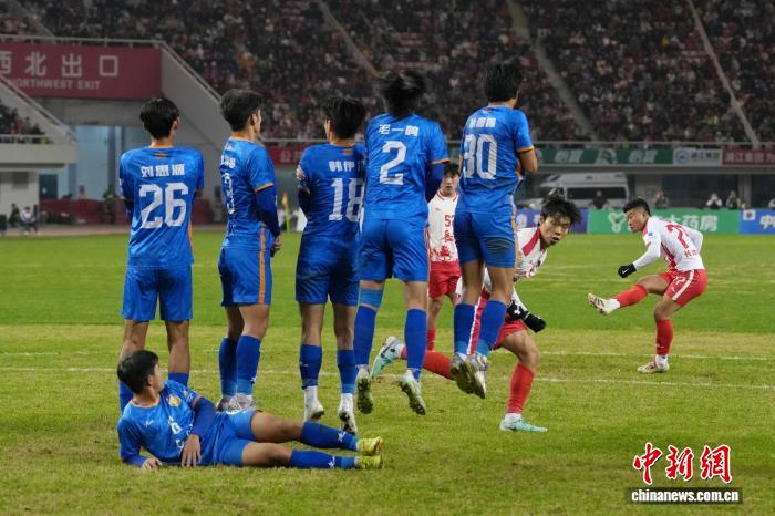 12月14日晚,2025湖南省足球聯(lián)賽淘汰賽四分之一決賽在長(zhǎng)沙進(jìn)行,長(zhǎng)沙隊(duì)主場(chǎng)2:0擊敗岳陽(yáng)隊(duì),成功晉級(jí)四強(qiáng)。圖為長(zhǎng)沙隊(duì)員陳琪(右一)任意球射門。中新社記者 楊華峰 攝