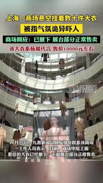 近日,有網友發帖反映,上海南京西一商場中庭懸掛著數十件長大衣,這些大衣懸掛高度不一,錯落分布在整個中庭空間,中間是品牌代言人的巨幅海報,奇特的布置讓不少網友直呼氣氛詭異,有點嚇人。