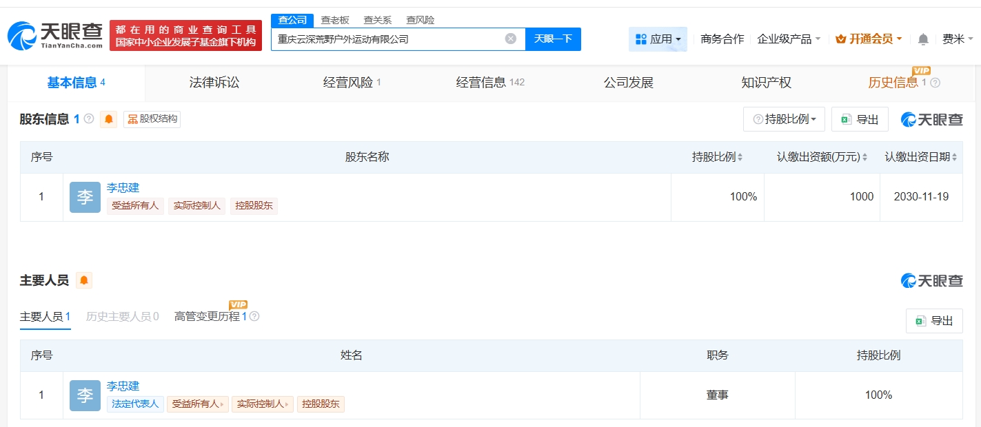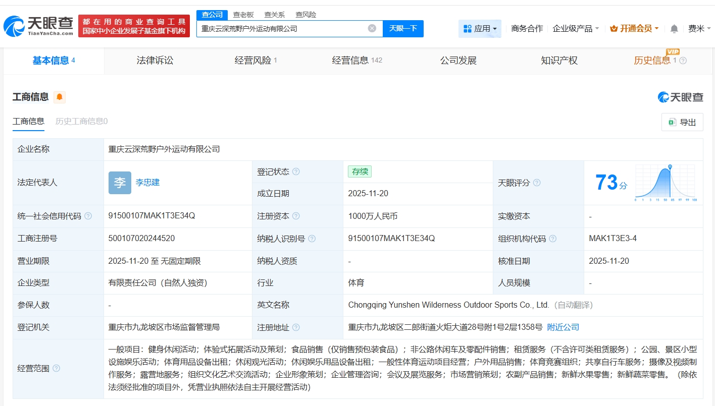 該公司成立于今年11月,法定代表人為李忠建,注冊資本1000萬人民幣,經(jīng)營范圍包括健身休閑活動、體驗式拓展活動及策劃、食品銷售等,由李忠建全資持股。
