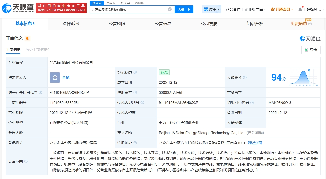 天眼查工商信息顯示,近日,北京晶澳儲能科技有限公司成立,法定代表人為金斌,注冊資本3億人民幣,經營范圍包括新興能源技術研發、儲能技術服務、新能源原動設備制造、新能源原動設備銷售等。股東信息顯示,該公司由晶澳科技(002459)旗下晶澳太陽能…