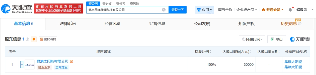 雷達財經訊,天眼查工商信息顯示,近日,北京晶澳儲能科技有限公司成立,法定代表人為金斌,注冊資本3億人民幣,經營范圍包括新興能源技術研發、儲能技術服務、新能源原動設備制造、新能源原動設備銷售等。股東信息顯示,該公司由晶澳科技(002459)旗下晶澳太陽能有限公司全資持股。