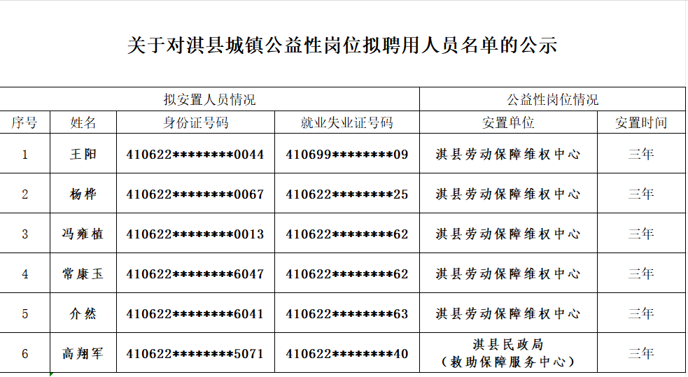 12月15日,據淇縣人社微信公眾號消息,根據《河南省公益性崗位管理辦法的通知》等規定,擬對王陽等6人的公益性崗位安置進行公示。