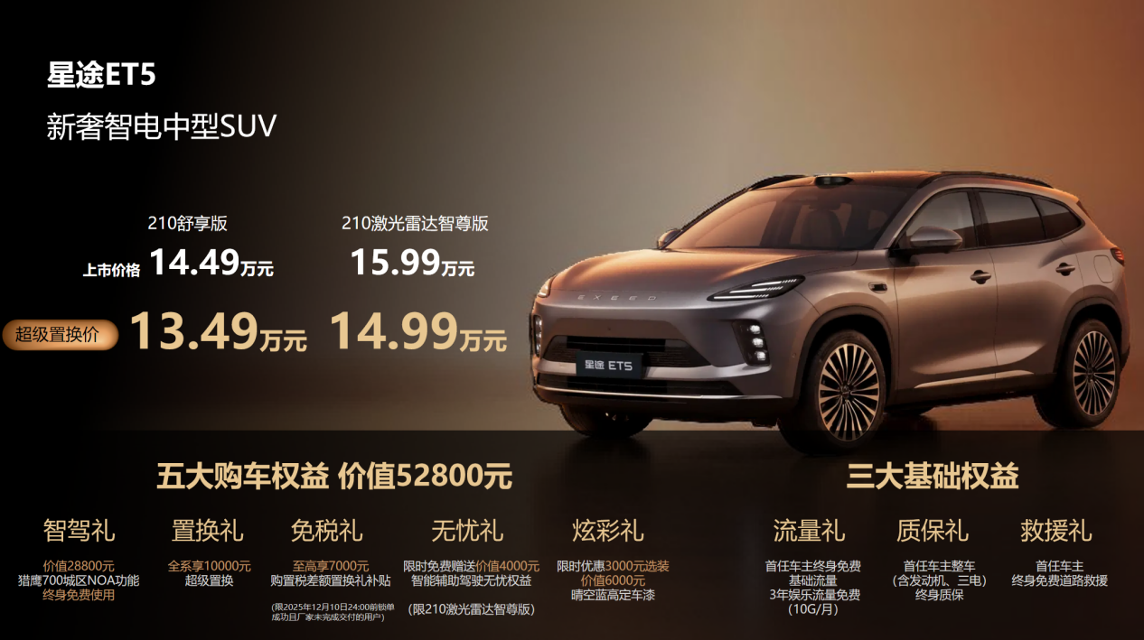 在萬眾期待的價格揭曉環節,星圖ET5正式公布兩款配置車型的官方指導價與專屬權益:210舒享版、210激光雷達智尊版官方指導價14.49萬元-15.99萬元,超級置換價低至13.49萬元-14.99萬元,以滿滿誠意回饋東北地區消費者。更重磅的是,品牌宣布獵鷹700城區NOA功能終身免費使用,同時退出價值52800元的五大限時購車權益,不分權益限時尊享。