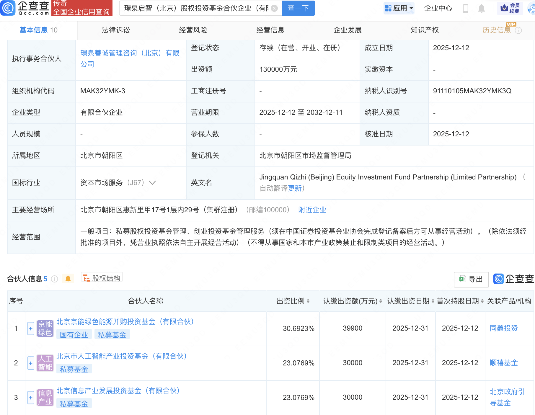 企查查APP顯示,近日,璟泉啟智(北京)股權投資基金合伙企業(有限合伙)成立,出資額13億元,經營范圍包含:私募股權投資基金管理、創業投資基金管理服務。企查查股權穿透顯示,該企業由北京京能綠色能源并購投資基金(有限合伙)、北京市人工智能產業投資基金(有限合伙)等共同出資。