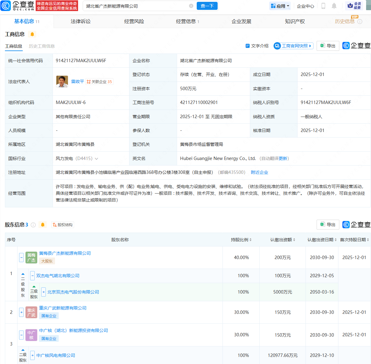 企查查APP顯示,近日,湖北省廣杰新能源有限公司成立,法定代表人為雷政平,經(jīng)營范圍包含:發(fā)電業(yè)務(wù)、輸電業(yè)務(wù)、供(配)電業(yè)務(wù);輸電、供電、受電電力設(shè)施的安裝、維修和試驗等。企查查股權(quán)穿透顯示,該公司由雙杰電氣(300444)旗下黃梅縣廣杰新能源有限公司、中廣核風(fēng)電有限公司旗下中廣核(湖北)新能源投資有限公司等共同持股。