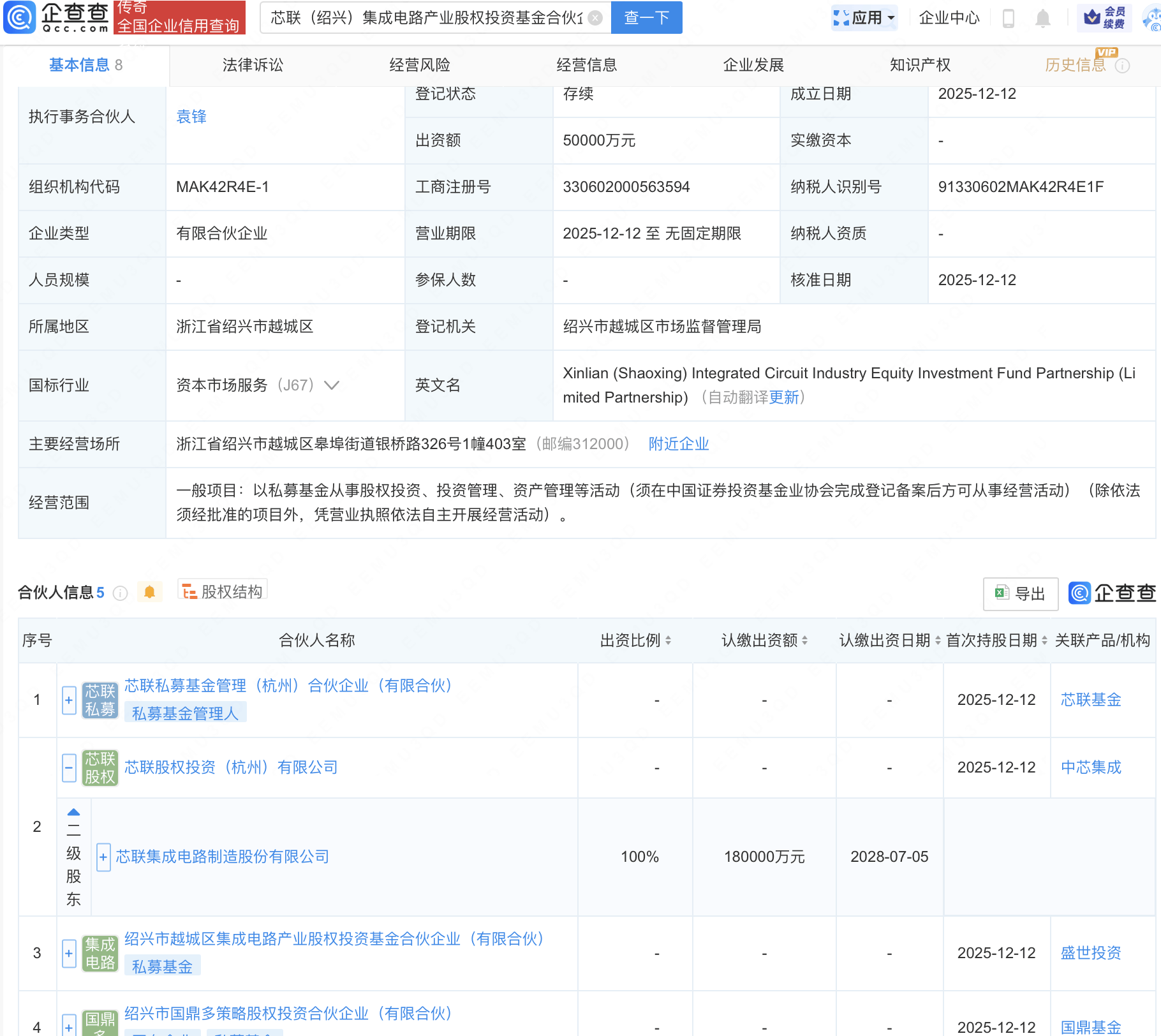 企查查APP顯示,近日,芯聯(紹興)集成電路產業股權投資基金合伙企業(有限合伙)成立,出資額5億元,經營范圍包含:以私募基金從事股權投資、投資管理、資產管理等活動。企查查股權穿透顯示,該企業由芯聯集成(688469)全資子公司芯聯股權投資(杭州)有限公司等共同出資。