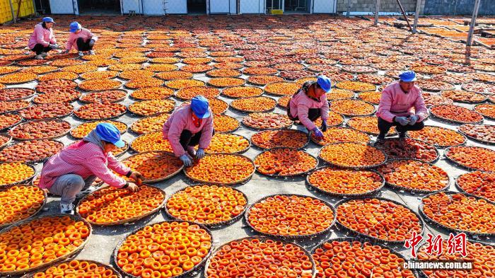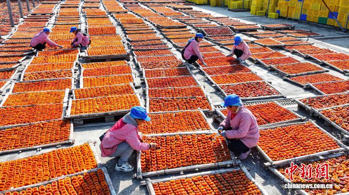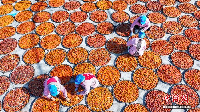 圖為平樂縣沙子鎮(zhèn)加工企業(yè)工人在翻曬柿餅。(無人機照片)楊宗盛 攝