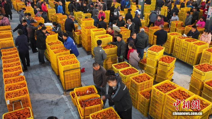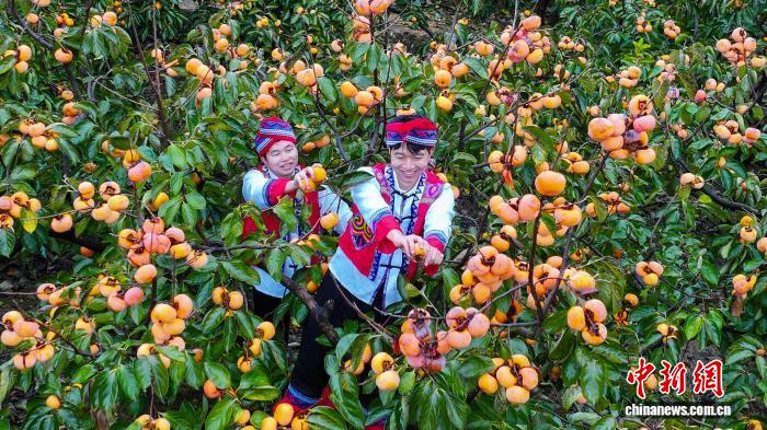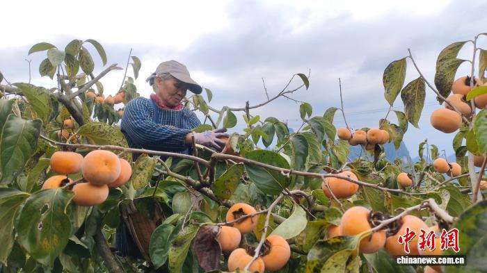 圖為果農(nóng)正在柿子種植基地采摘柿子。楊宗盛 攝