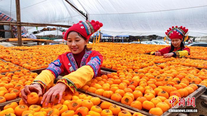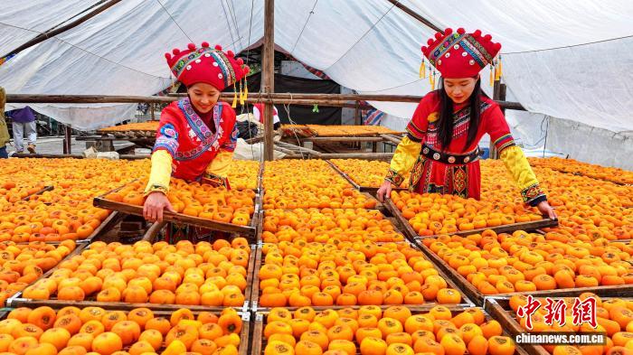 圖為民眾在搬移晾曬棚里的柿子。楊宗盛 攝