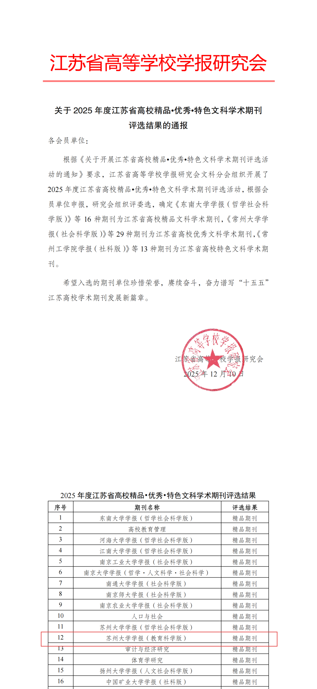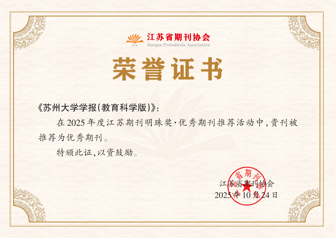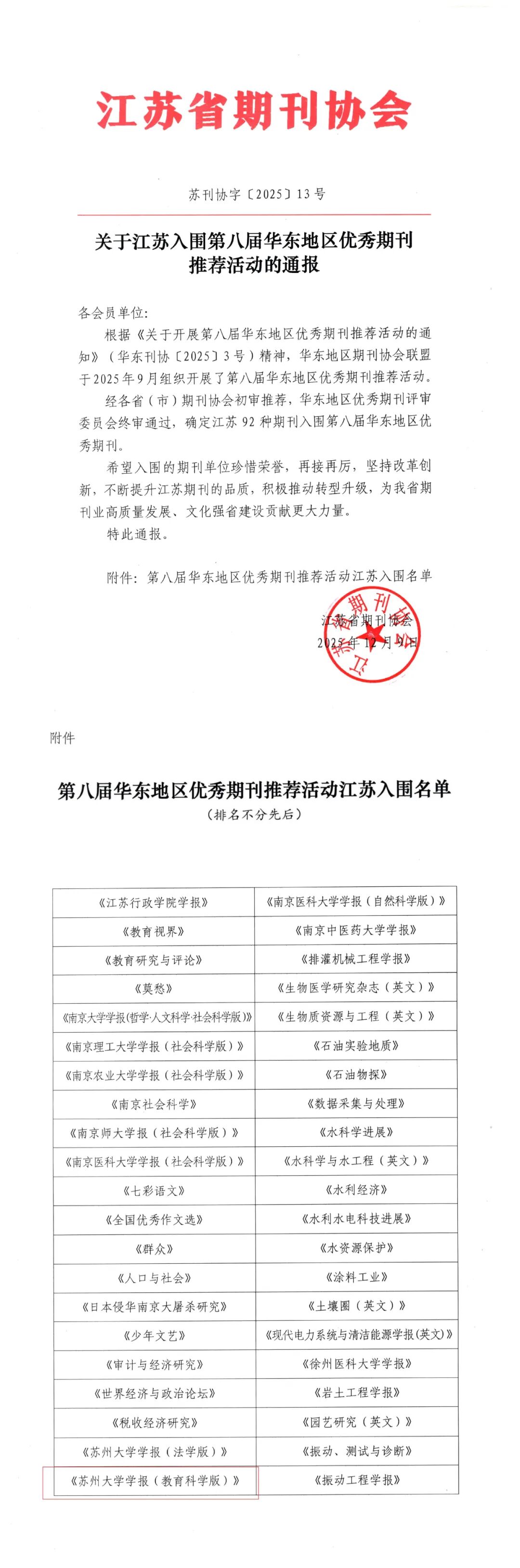 近日,第八屆華東地區優秀期刊推薦活動名單正式發布。經各省(市)期刊協會初審推薦、華東地區優秀期刊評審委員會終審評定,江蘇省共92種期刊入選。《蘇州大學學報(教育科學版)》榮列其中,獲評“第八屆華東地區優秀期刊”。