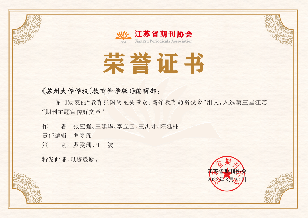 2025年以來,本刊還先后榮獲“江蘇期刊明珠獎·優秀期刊”“江蘇省高校精品文科學術期刊”等稱號。刊文入選第三屆江蘇“期刊主題宣傳好文章”。多項榮譽的取得,體現了學術界與期刊界對我刊辦刊質量與學術影響力的高度認可,也為期刊進一步發展注入了堅實動力。