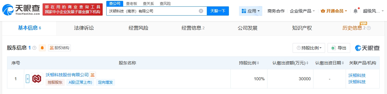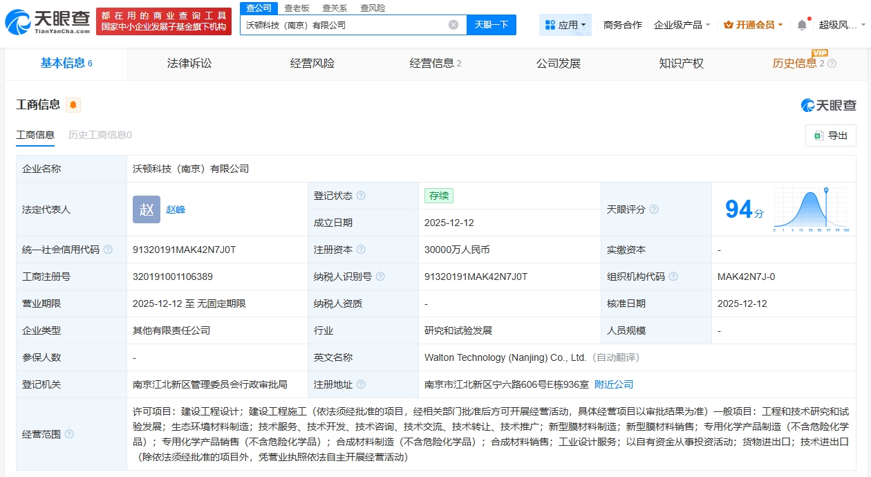 天眼查工商信息顯示,近日,沃頓科技(南京)有限公司成立,法定代表人為趙峰,注冊資本3億人民幣,經營范圍包括建設工程設計、建設工程施工、工程和技術研究和試驗發展、生態環境材料制造等。股東信息顯示,該公司由沃頓科技(000920)全資持股…