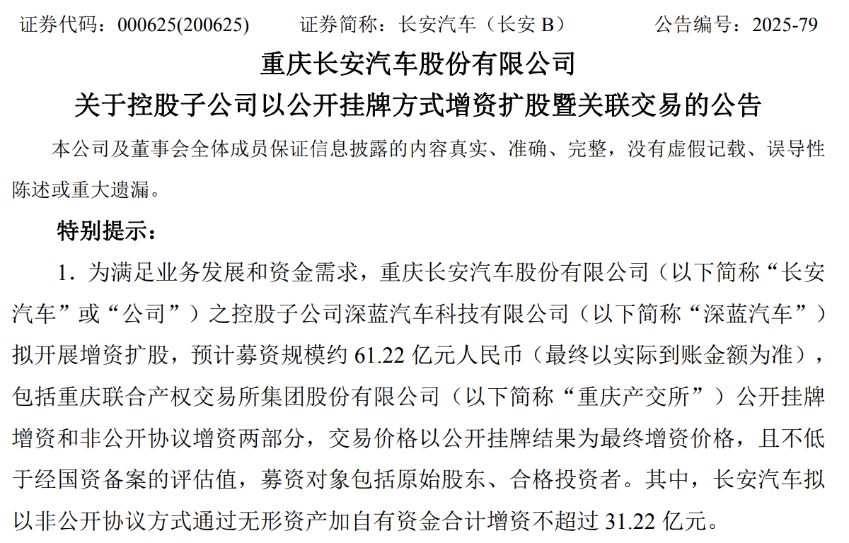 瑞財經 張林霞 長安汽車(SZ000625)發布公告稱,為滿足業務發展和資金需求,深藍汽車擬開展增資擴股,預計募資規模約61.22億元。