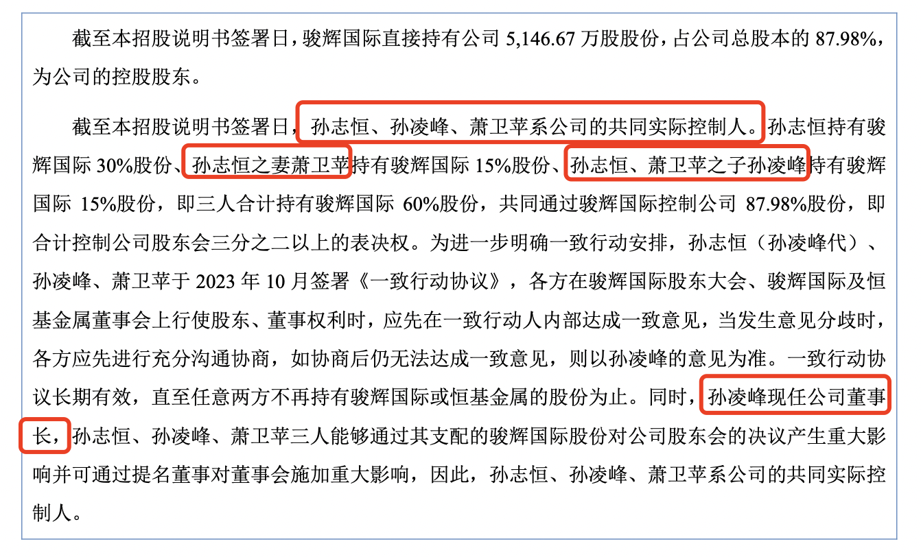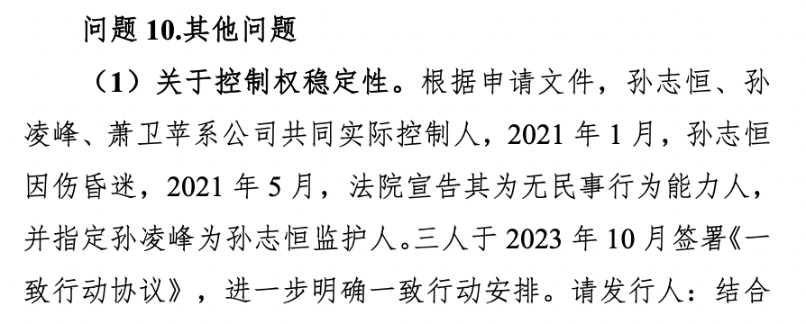 根據(jù)申請文件,孫志恒、孫凌峰、蕭衛(wèi)蘋系公司共同實際控制人,2021年1月,孫志恒因傷昏迷,2021年5月,法院宣告其為無民事行為能力人,并指定孫凌峰為孫志恒監(jiān)護人。三人于2023年10月簽署《一致行動協(xié)議》,進一步明確一致行動安排。
