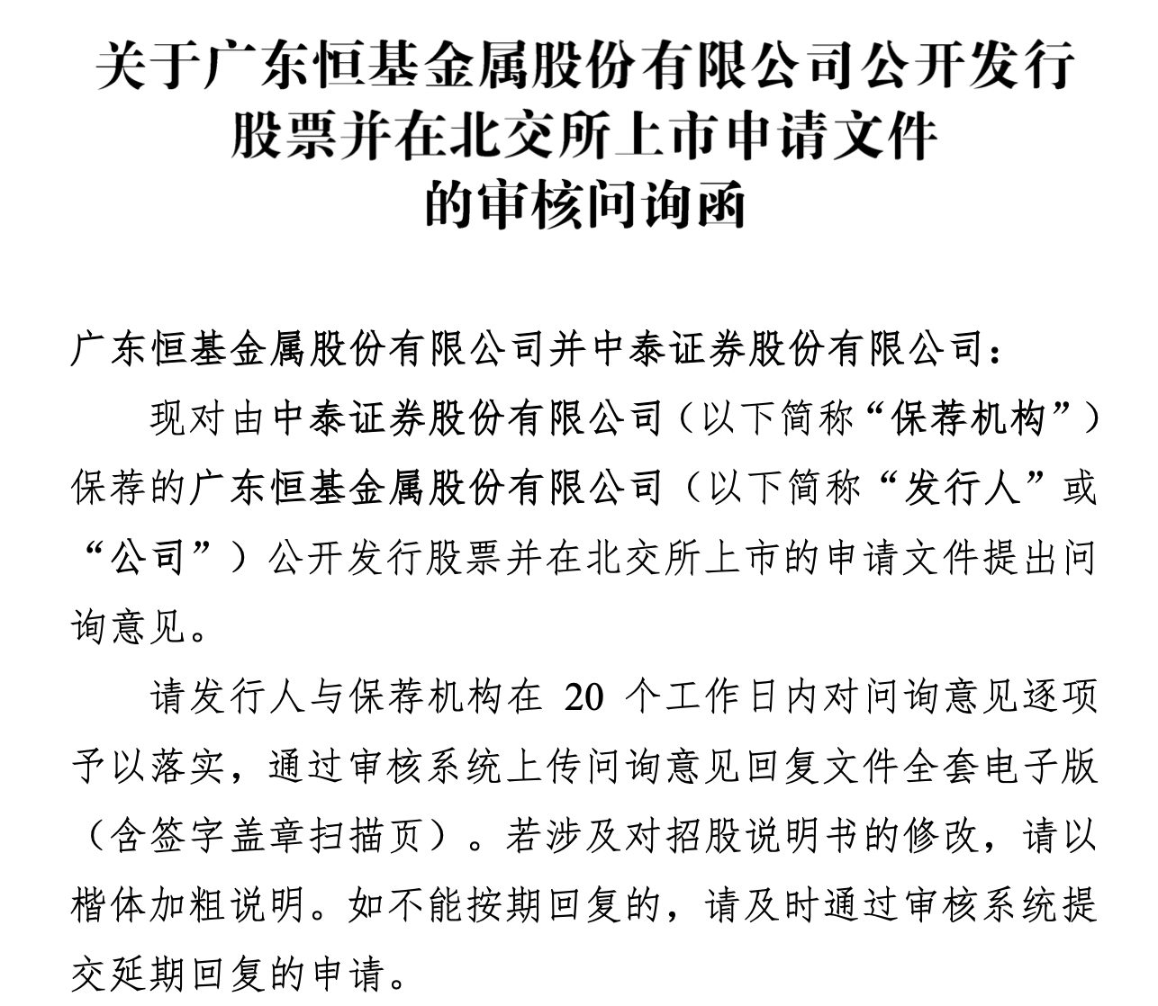 瑞財經(jīng) 吳文婷 近日,廣東恒基金屬股份有限公司(以下簡稱“恒基金屬”)披露北交所IPO審核問詢函,保薦機構(gòu)為中泰證券股份有限公司。