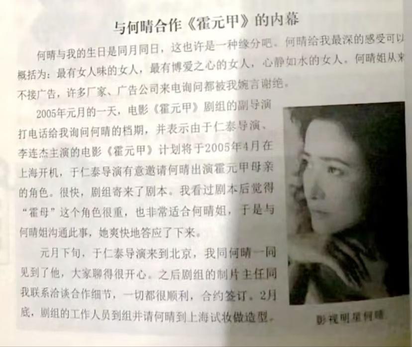 經(jīng)紀人說,2006年李連杰拍《霍元甲》時,特意找過何晴,想讓她演霍元甲的母親。