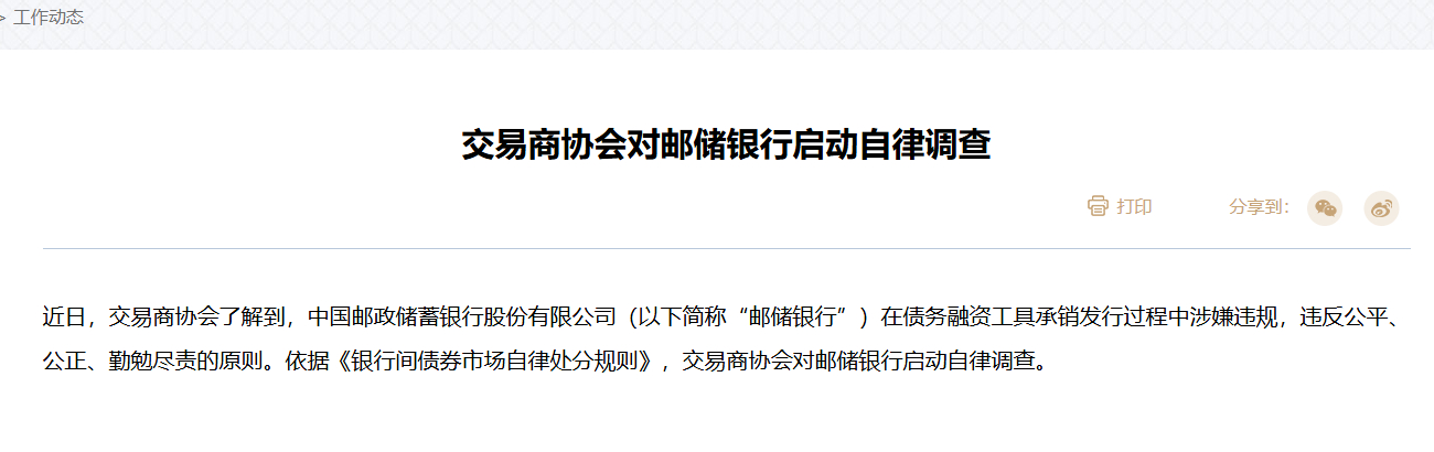 近日,交易商協會了解到,中國郵政儲蓄銀行股份有限公司(以下簡稱“郵儲銀行(601658)”)在債務融資工具承銷發行過程中涉嫌違規,違反公平、公正、勤勉盡責的原則。依據《銀行間債券市場自律處分規則》,交易商協會對郵儲銀行啟動自律調查。(交易商協會官網)