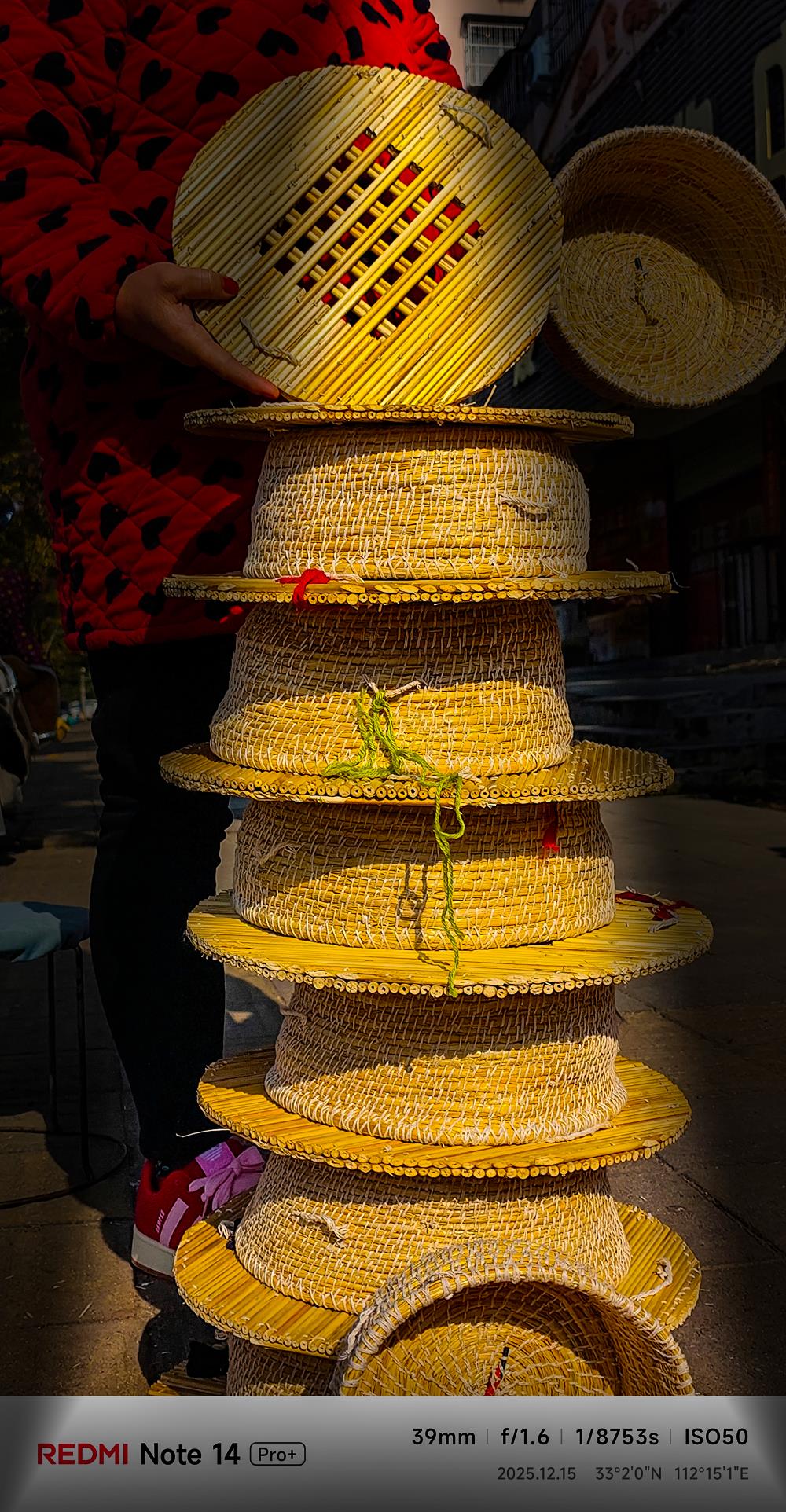 最打眼的便是層層堆疊的茅草桿蒸鍋蓋與餾饃拍子,草桿紋路在陽光下清晰可辨,粗糲里藏著細膩,每一道編織都浸著老手藝的質樸與歲月的溫厚,滿是人間煙火的實在。陽光輕輕灑在器物上,草桿紋理錯落有致,手作的溫度悄悄揉進日常物件里,既是廚房里最接地氣的溫暖,也藏著平凡生活里最動人的本真。