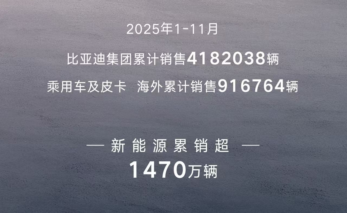 截至11月,比亞迪全球新能源汽車累計銷量達1470萬輛,依托完整的產品布局和不斷擴展的海外市場,其規模優勢與體系優勢將愈發顯現。