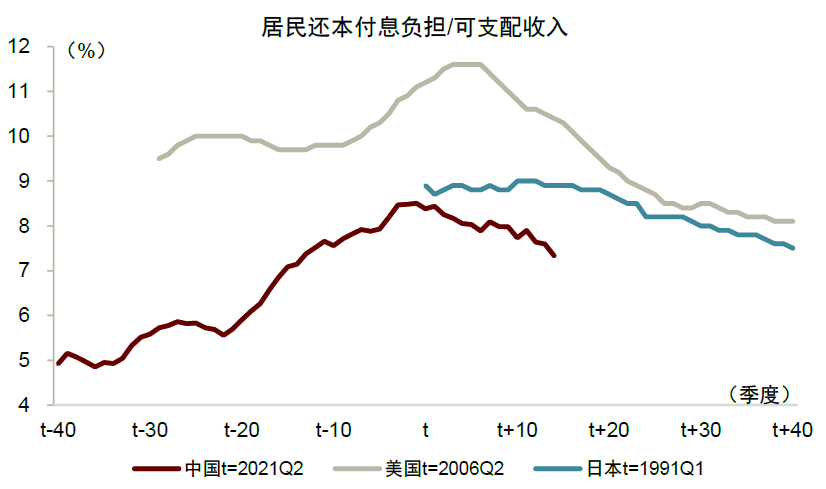 圖表:中美日金融周期調整前后居民還本付息情況。注:居民還本付息負擔為家庭部門債務還本付息總額的季度值,可支配收入為家庭部門總體可支配收入四個季度的移動平均值。
