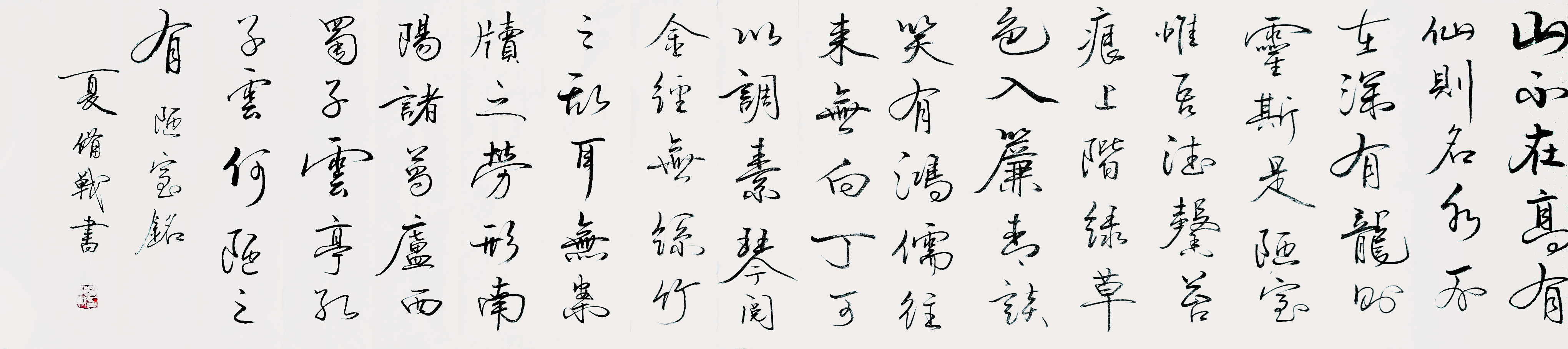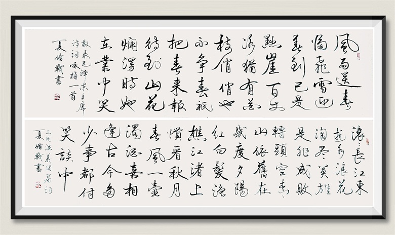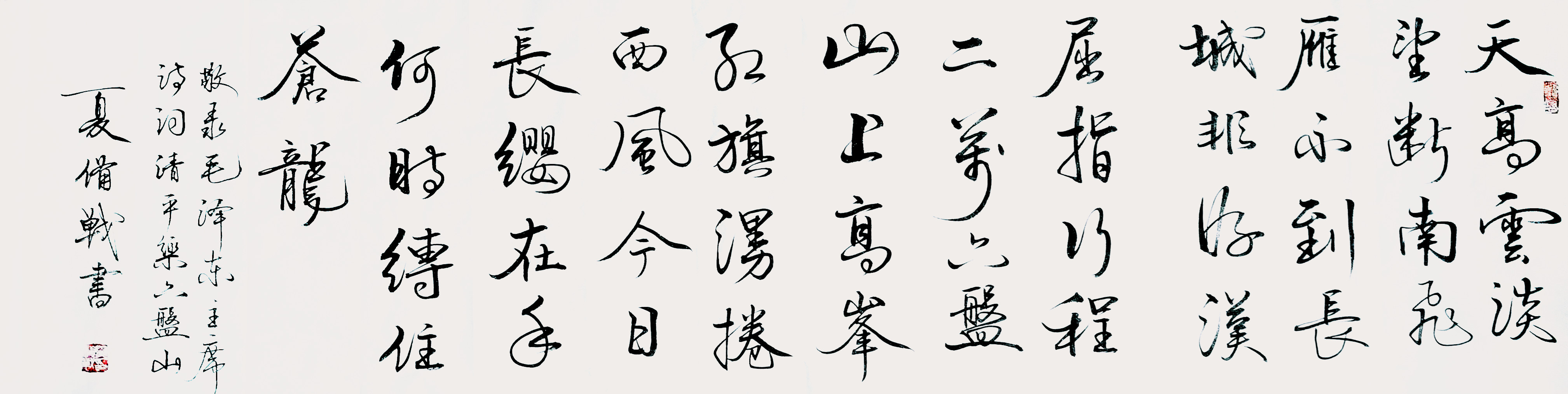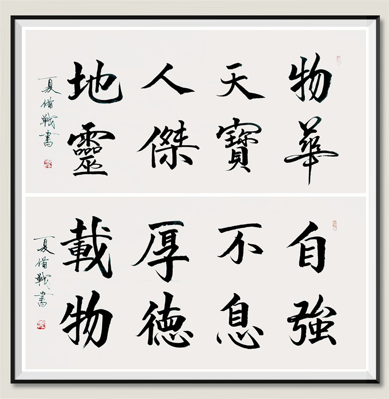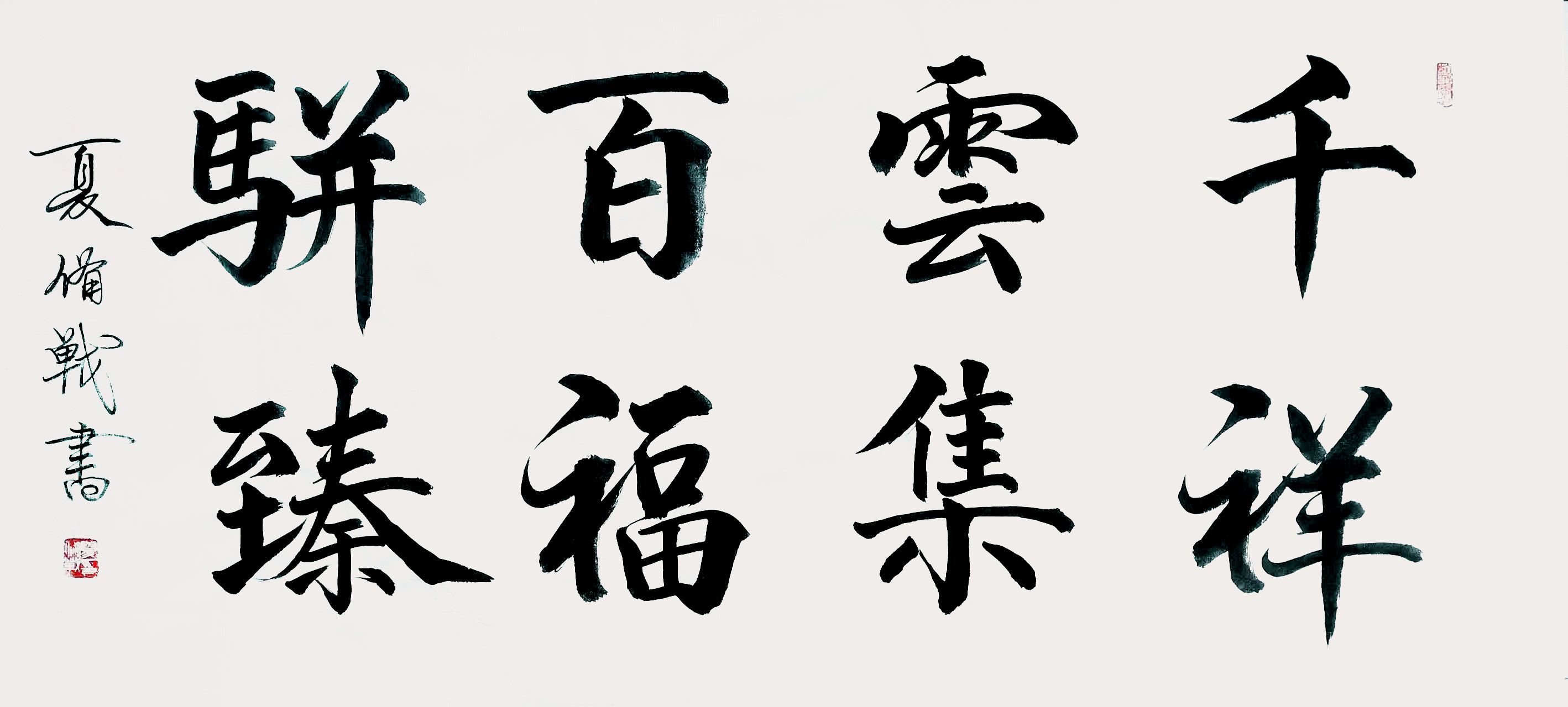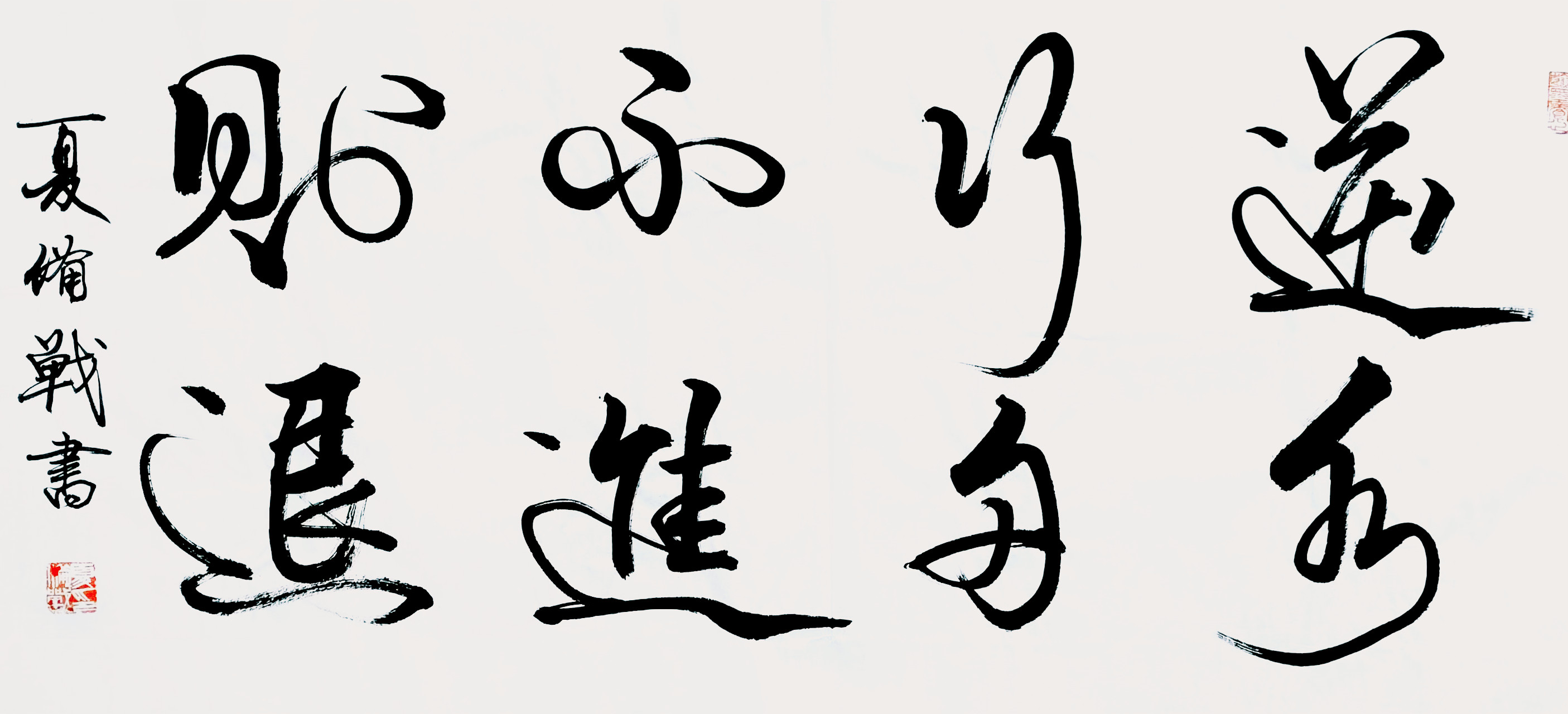 夏備戰書法,筆力遒勁,線條剛柔相濟,如行云流水而不失骨力;墨色層次豐富,枯潤相生,韻味悠長,于筆墨流轉間盡顯深厚傳統造詣。他深耕歷代名家經典,臨習不輟,兼收并蓄諸家之長;更注重書法理論研修與字外功夫積淀,融古今之韻,拓藝術新境,終成獨樹一幟的藝術風格。