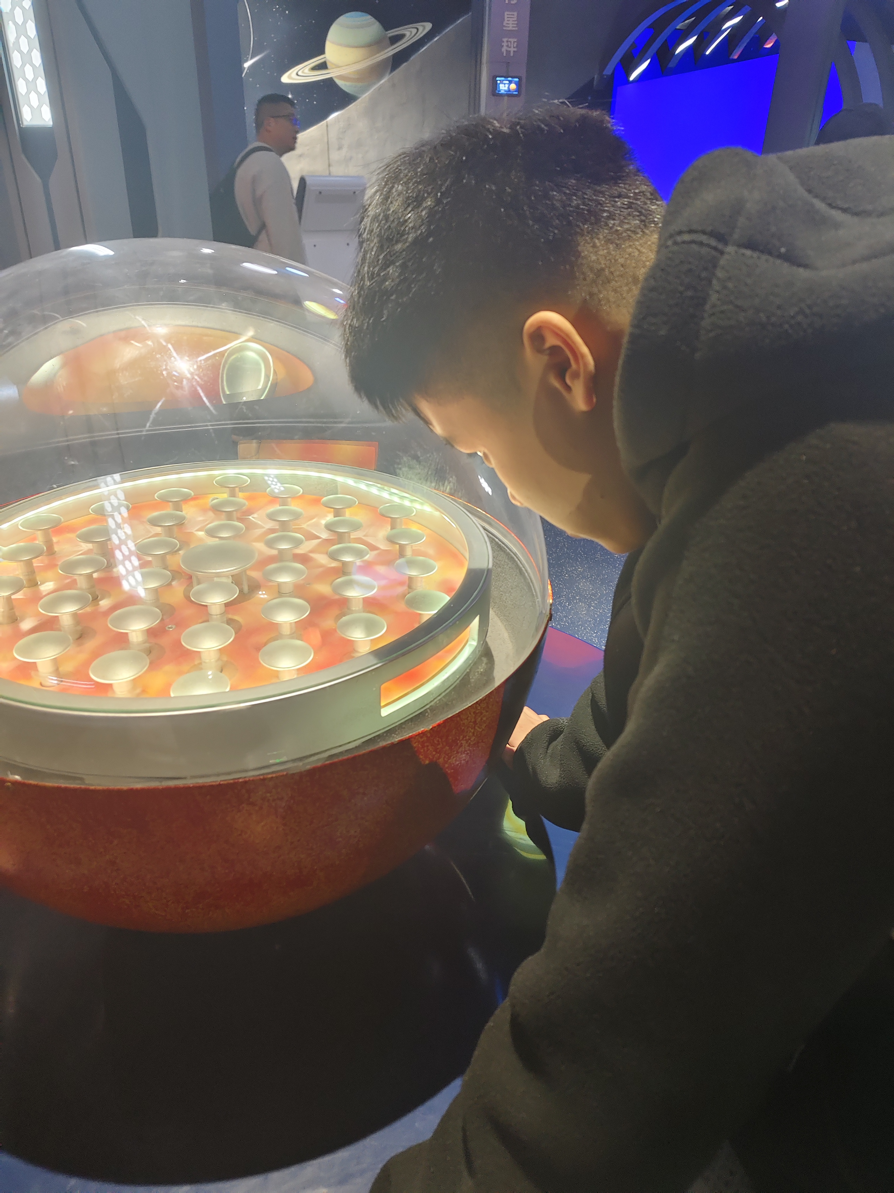 車子穩穩停在科技館門口,阿锃一下車就迫不及待地往場館里走,小腳步伐輕快得像揣著滿心的期待。一踏進一樓大廳,他的目光就被兒童區域牢牢吸引,嘴里小聲念叨著“鯊魚”“烏龜”,眼睛里亮閃閃的滿是向往。志愿者們本想預約帶他進去體驗,卻無奈因為年齡限制未能如愿,只好笑著牽起他的手,帶著他去探索場館的其他區域。逛到光子運動現象展區時,阿锃突然停下了腳步,目光緊緊鎖在那些跳動的球類演示裝置上,一站就是好久,志愿者們幾次招呼他去下一個展區,他都舍不得挪動腳步,小腦袋微微歪著,專注的模樣惹人憐愛。 薛淦澤看著阿锃專注盯著展品時發亮的眼睛,心里滿是觸動:“能看到他這樣興奮的模樣,就覺得今天的陪伴特別有意義。”