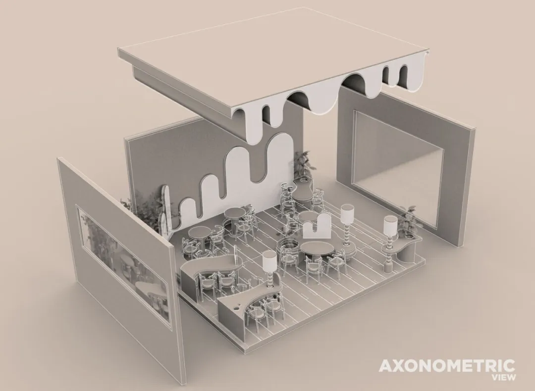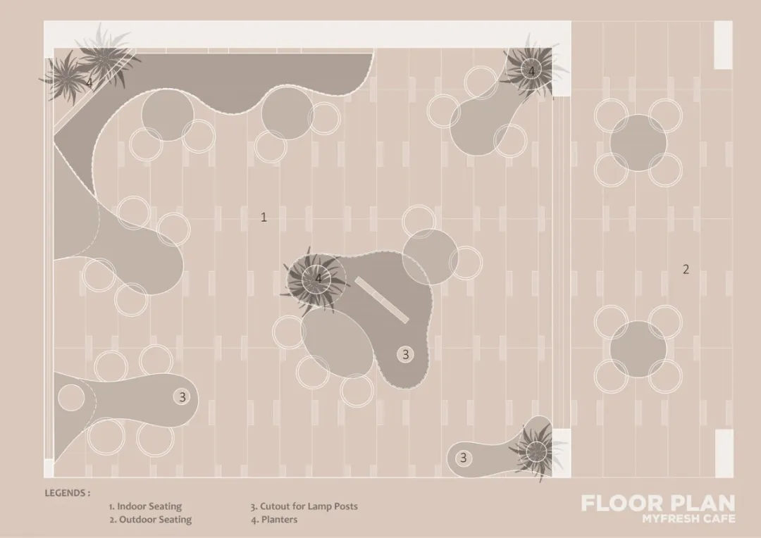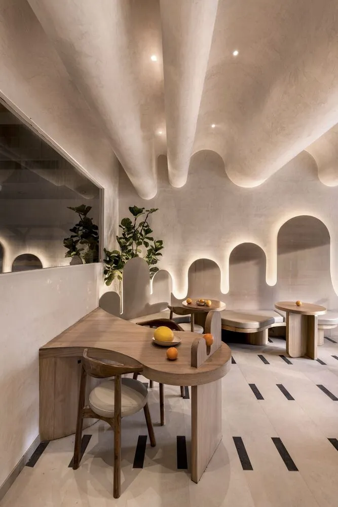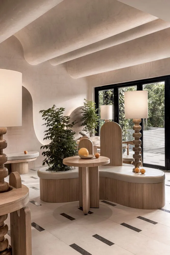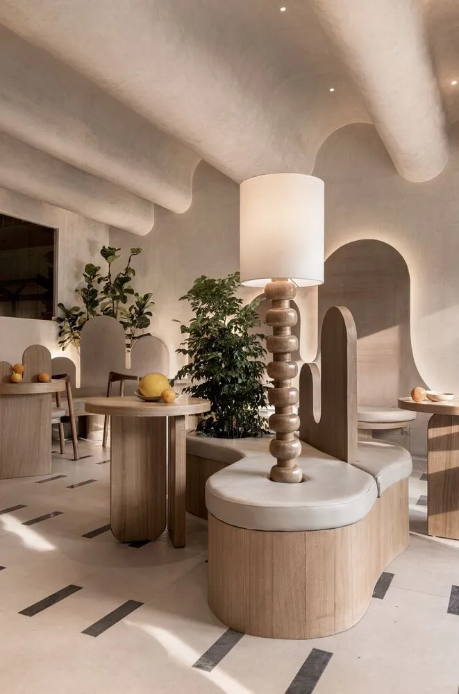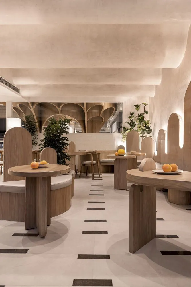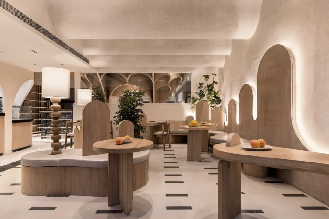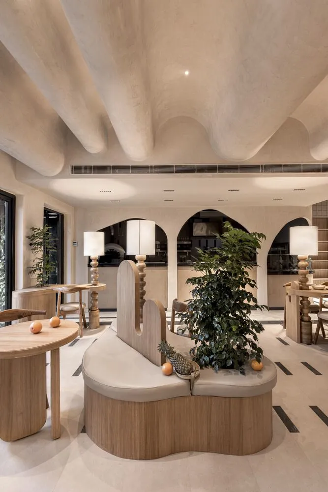 點綴其間的綠植與落地燈形成第三層敘事,賦予空間垂直張力與景深。整體動態感通過米色與淺黃褐的單色調和得以平衡。Myfresh Café 最終呈現為一個呼應顧客情緒、憑借飽滿曲線語言營造沉浸魔力的當代空間。