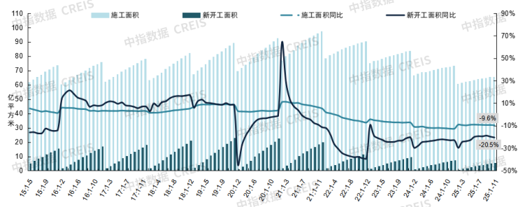 房屋施工面積:1-11月,全國房屋施工面積為65.61億平方米,同比下降9.6%;其中,住宅施工面積為45.76億平方米,同比下降10.0%。
