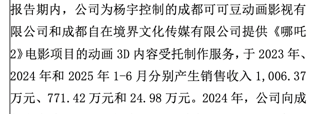 值得一提的是,報告期內,公司為楊宇控制的成都可可豆動畫影視有限公司和成都自在境界文化傳媒有限公司提供《哪吒2》電影項目的動畫3D內容受托制作服務,于2023年、2024年和2025年1-6月分別產生銷售收入1,006.37萬元、771.42萬元和24.98萬元。