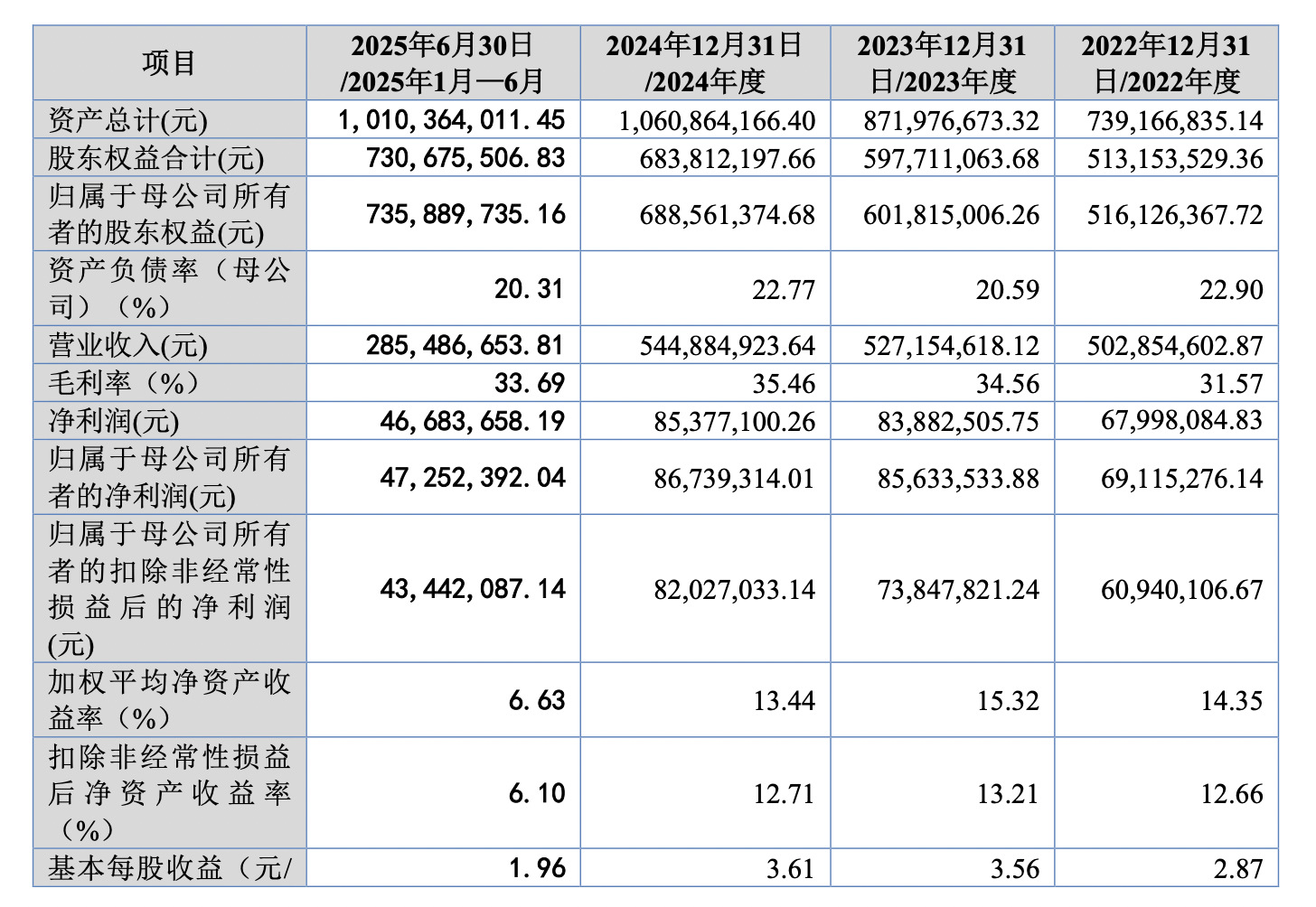 業績方面,2022年-2024年及2025上半年,原力數字實現營收分別為5.03億元、5.27億元、5.45億元、2.85億元;歸母凈利潤分別為6911.53萬元、8563.35萬元、8673.93萬元、4725.24萬元。