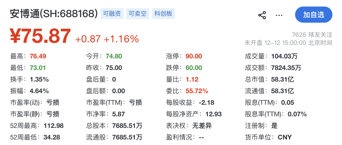 截至發稿時,安博通A股報75.87元,漲1.16%,總市值約58.31億元。