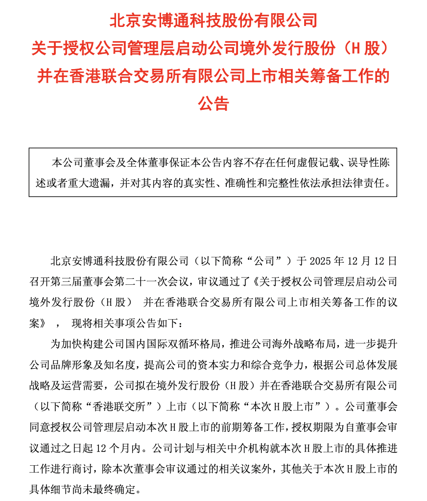 瑞財經 吳文婷 12月14日,安博通發布公告稱,公司于2025年12月12日召開第三屆董事會第二十一次會議,審議通過了《關于授權公司管理層啟動公司境外發行股份(H股) 并在香港聯合交易所有限公司上市相關籌備工作的議案》。