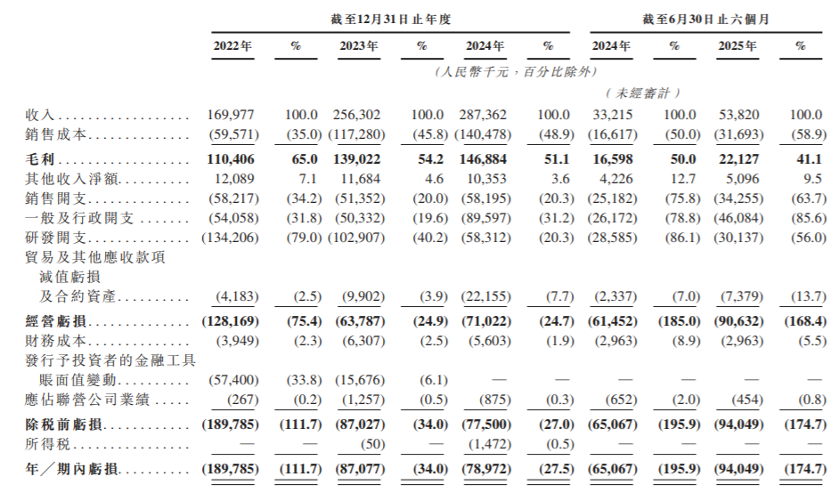 業績方面,2022年、2023年、2024年和2025年前六個月,五一視界的營業收入分別為1.70億、2.56億、2.87億和0.54億元;相應的凈虧損分別為1.90億、0.87億、0.79億和0.94億元,相應經調整凈虧損分別為1.32億、0.68億、0.43億和0.67億元。