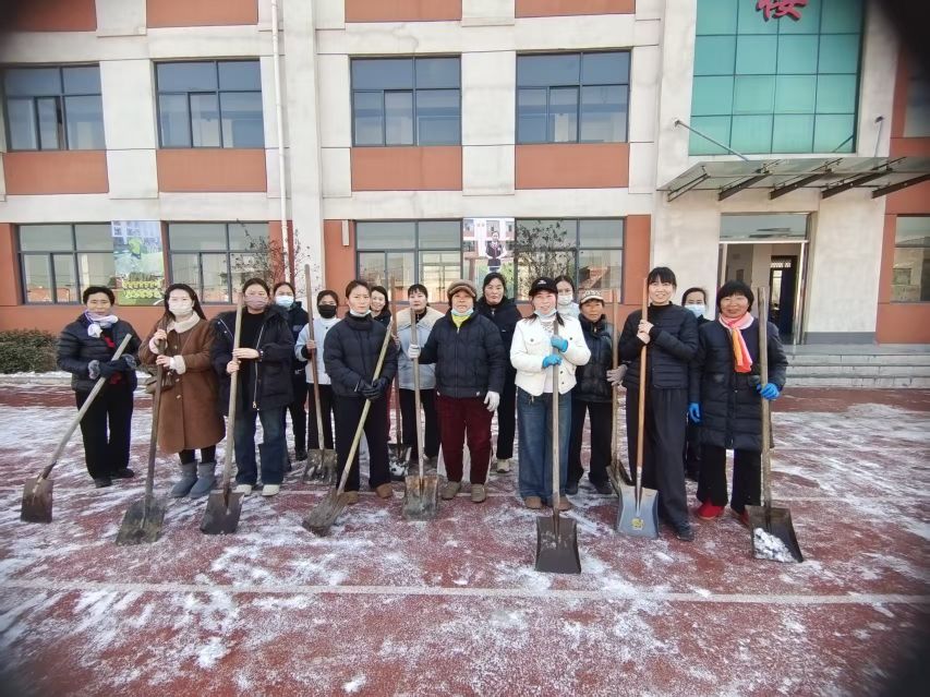 有的家長揮著鐵鍬,把路面上厚厚的積雪一鏟一鏟堆到路邊;有的握著掃帚,仔仔細細清掃著臺階和墻角的殘雪;還有的家長干脆挽起袖子,合力搬起路邊凍得硬邦邦的冰塊。校園里滿是鐵鍬鏟雪的“咯吱”聲和掃帚劃過地面的“唰唰”聲。