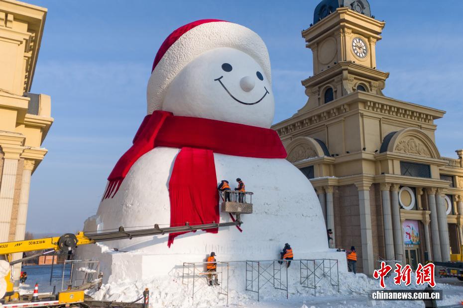 12月15日,在黑龍江省哈爾濱市道里區群力音樂公園,“網紅大雪人”主體完工,驚艷亮相。頂流大雪人戴著紅帽子、系著紅圍脖,用憨態可掬的微笑迎接八方來客。今年回歸的大雪人再次升級,身高達19米,總用雪量超過3000立方米,達到歷年之最。作為松花江畔的冬季標志性景觀,大雪人的回歸為哈爾濱增添了更多童話色彩,吸引眾多市民游客前來打卡留念。圖為施工人員調整大雪人圍脖。