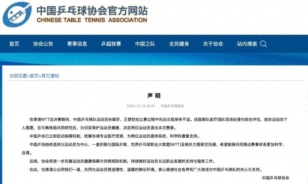2025年12月13日和14日,WTT香港總決賽的球臺(tái)邊,發(fā)生了讓無(wú)數(shù)球迷揪心的一幕。 國(guó)乒絕對(duì)主力孫穎莎和王楚欽,先后因身體不適退出了單打比賽。 一時(shí)間,猜測(cè)四起。 當(dāng)晚,中國(guó)乒協(xié)的聲明迅速給事件定了調(diào):這不是意外,而是一次基于醫(yī)療評(píng)估、尊重個(gè)人意愿、經(jīng)過(guò)團(tuán)隊(duì)研究的主動(dòng)保護(hù)。