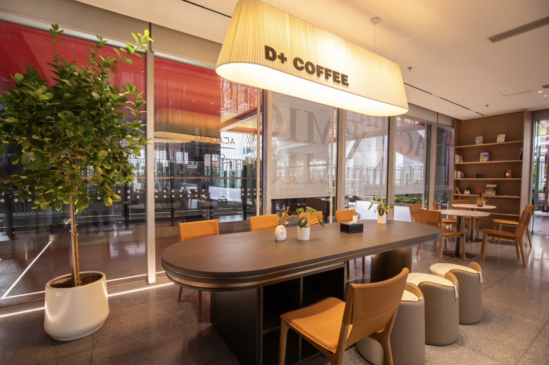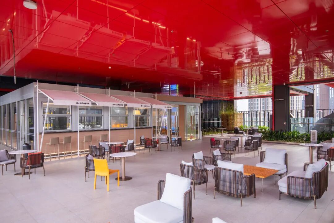 150㎡咖啡廳(D+Cafe)搭配200㎡戶外紅院子,室內室外結合,室內可容納40-60人,室外可容納80人,配備LED移動屏幕、移動音箱、麥克風、全場燈光、可升降窗簾等,兼具文藝范與實用性。
