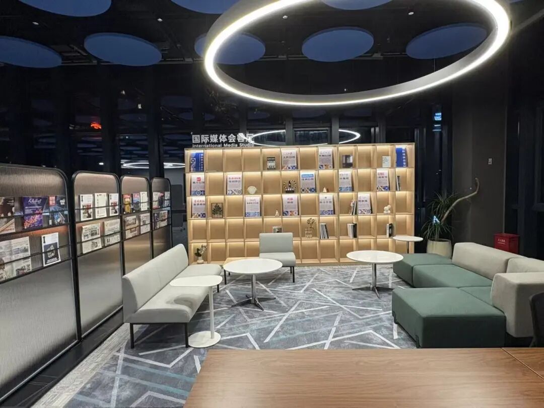 國際媒體會客廳:配備沙發、雜志架、媒體展板,可承接媒體類采訪活動。