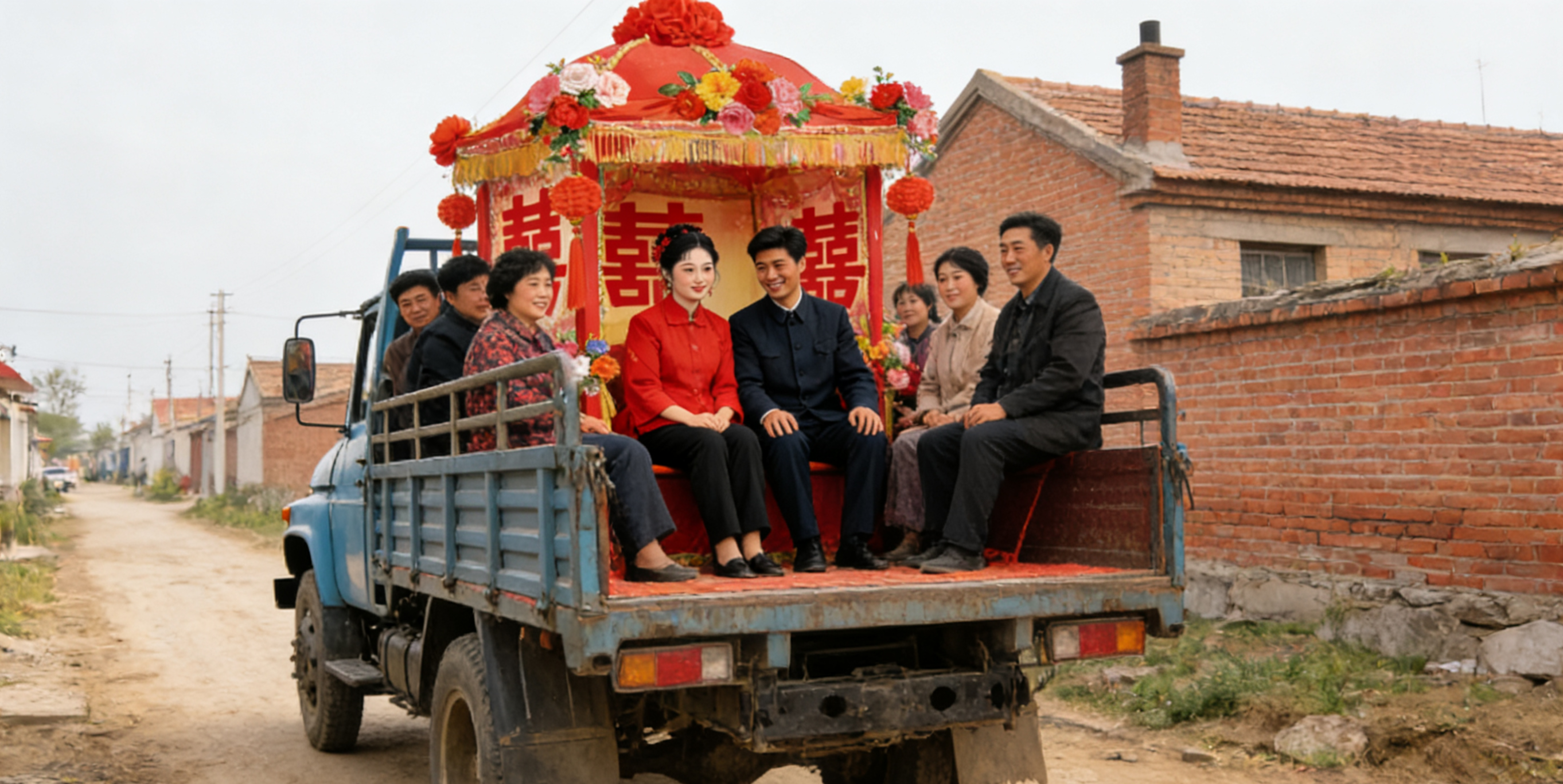 要是誰家條件好,能借來一輛東風卡車,那可就了不得了!高高的車廂敞著,新娘子穿著紅裙子坐在里廂子,娘家送親的人圍著她,車廂欄桿上還系著紅布條,車子開過塵土飛揚的土路,氣派得能讓我們記好幾天。