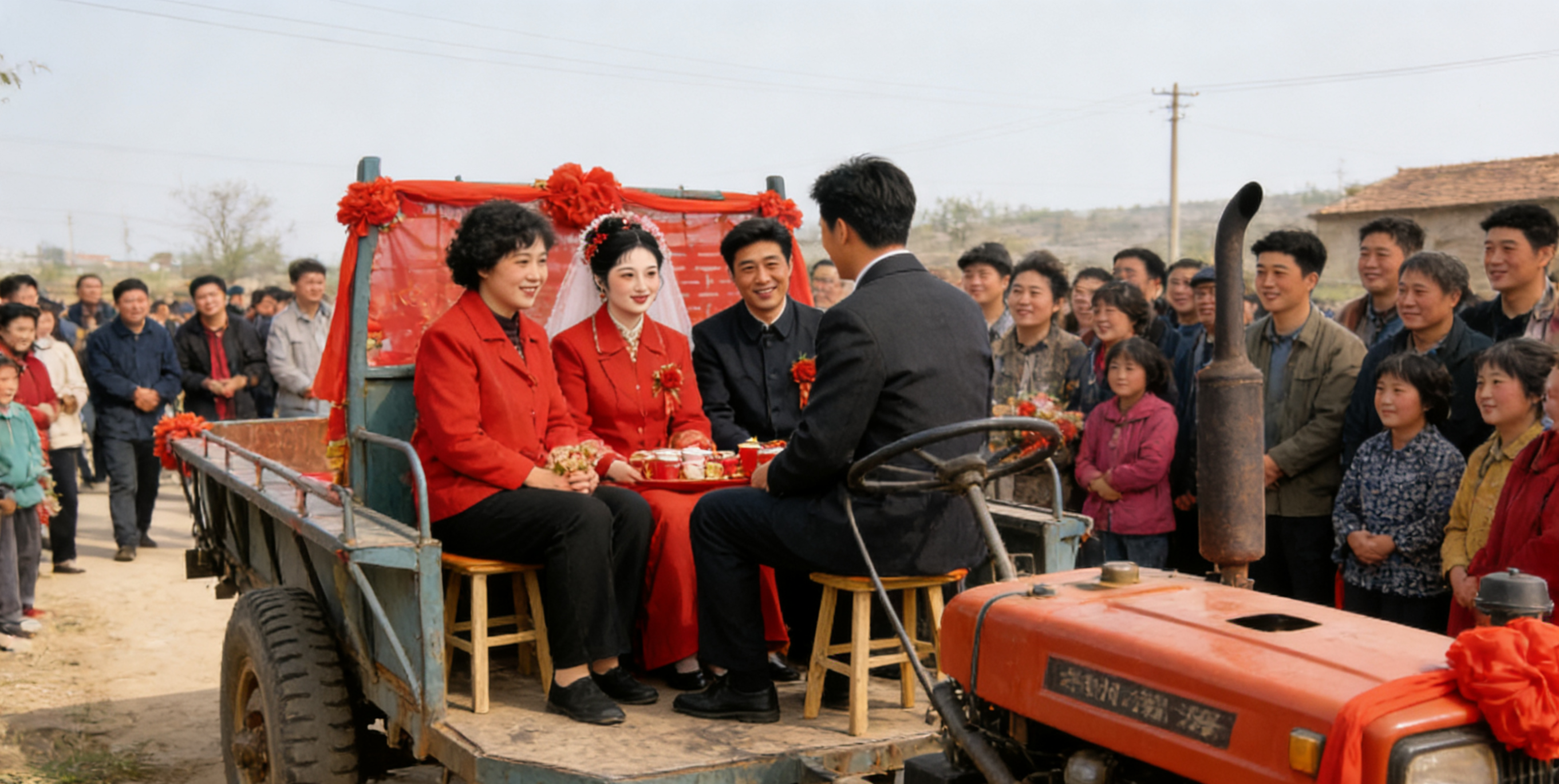 后來,自行車漸漸稀罕不起來了,換成了“突突突”響的拖拉機,車斗里鋪著一條床單,新娘坐在小板凳上,陪嫁的大姑娘小媳婦也擠在一塊兒,說說笑笑的,風都跟著甜。