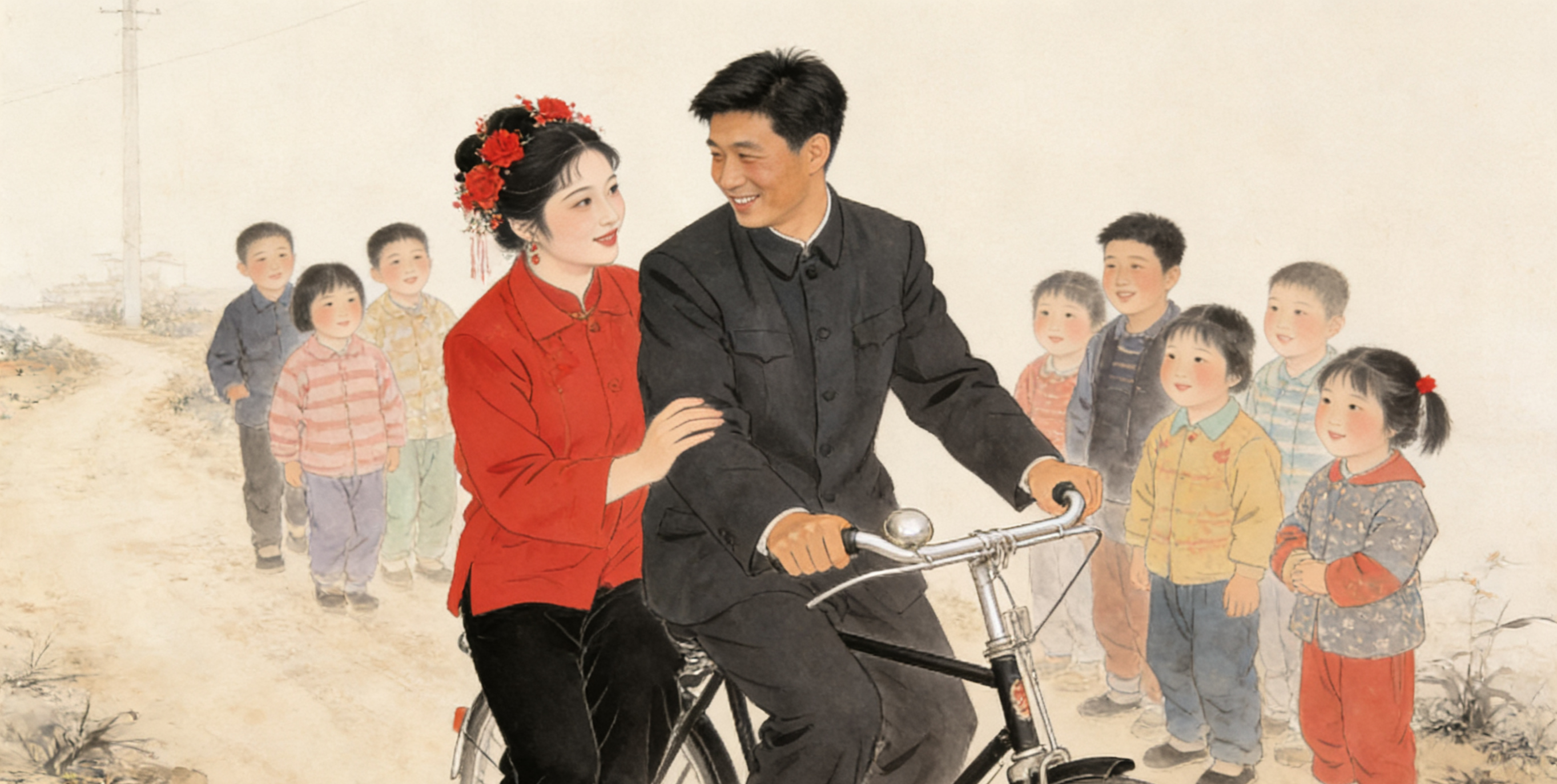 新郎騎車自行車,車把上綁著紅綢子,車后座墊著新墊子,新娘子穿著紅衣裳,胸前別著一朵艷紅的大絨花,羞答答地側坐著,手緊緊把住新郎的后衣角。