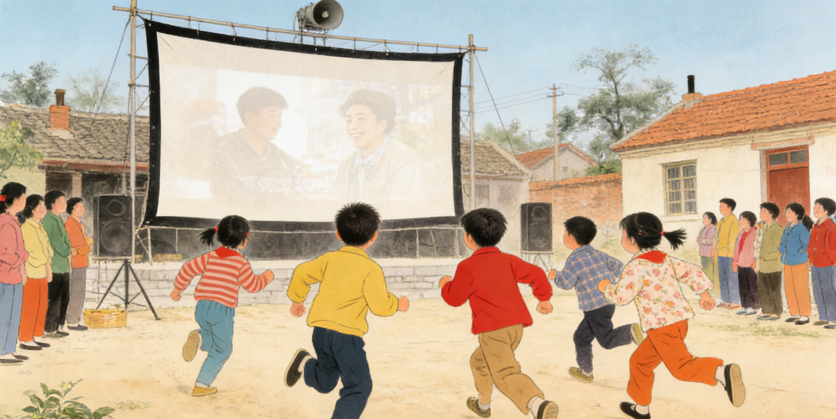 到了晚上,最讓人期待的環節來了——村里會在曬谷場上搭起銀幕,放一場露天電影。消息像長了翅膀,三里五村的人都趕來了,搬著小板凳,扛著竹椅子,早早地占好了位置。曬谷場上黑壓壓的一片人,孩子們在人縫里鉆來鉆去,大人拉著家常,銀幕一亮,全場就安靜下來。
