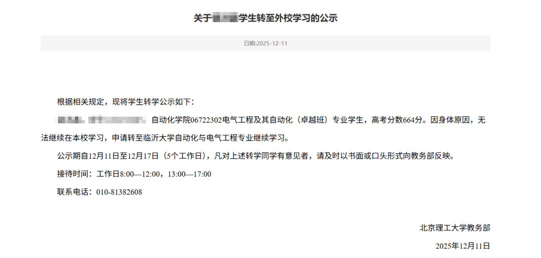12月11日,北京理工大學教務部公示顯示,學校電氣工程及其自動化(卓越班)專業的一名學生,申請轉學至臨沂大學自動化與電氣工程專業繼續學習。