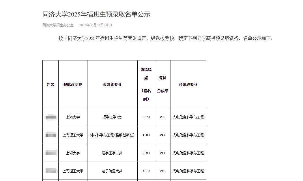 另外,也有通過”插班“實現轉學的案例。今年6月,上海市插班生考試傳來捷報——在同濟大學2025年插班生考試預錄取名單中,兩名來自上海理工大學的本科生成功獲得錄取資格,實現了從非“雙一流”高校到985高校的跨越式轉變。