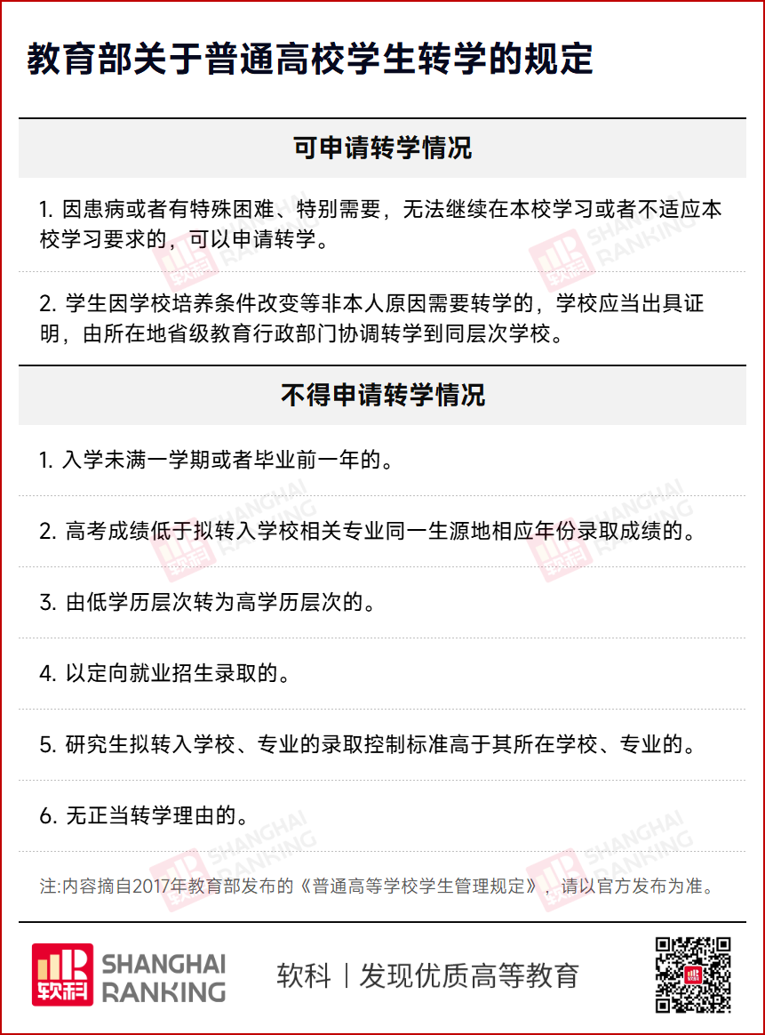 根據教育部2017年發布的《普通高等學校學生管理規定》(教育部令第41號),學生一般應當在被錄取學校完成學業。因患病或者有特殊困難、特別需要,無法繼續在本校學習或者不適應本校學習要求的,可以申請轉學。學生因學校培養條件改變等非本人原因需要轉學的,學校應當出具證明,由所在地省級教育行政部門協調轉學到同層次學校。