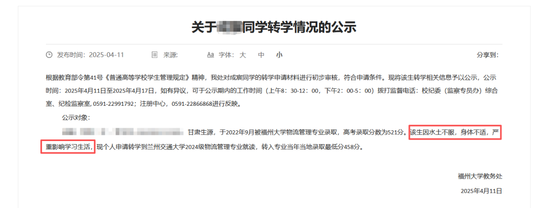 “因患病或者有特殊困難、特別需要”可申請轉學,常見情形包括水土不服、環境和飲食習慣不同等等造成身體不適。例如,今年4月11日,福州大學在一則轉學公示中提到,一名學生因“水土不服,身體不適,嚴重影響學習生活”,申請轉入蘭州交通大學就讀。