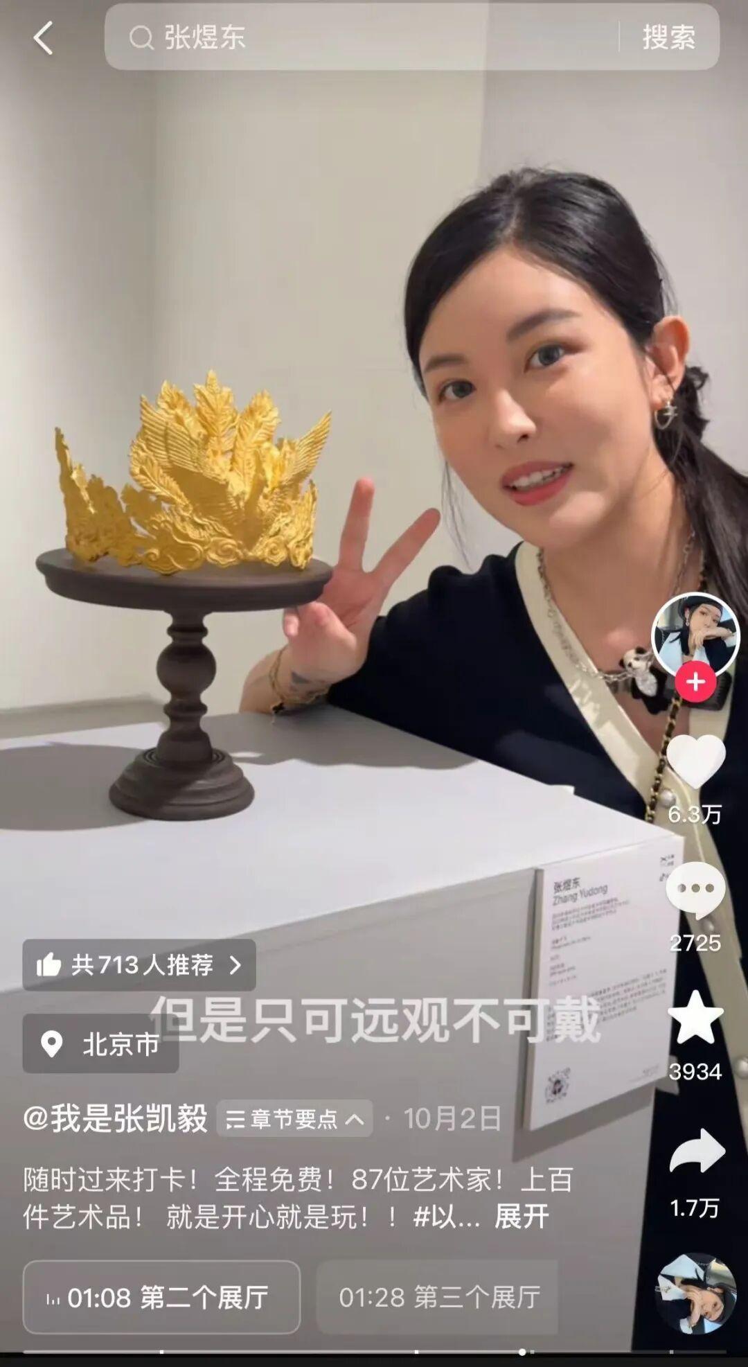 記者注意到,今年10月2日,@我是張凱毅發布了一則視頻,稱其老公要免費請大家看展,辦展地點在北京X美術館內,該展覽有87位藝術家共計上百件藝術品展出。在該視頻中,其也提到過黃金鳳冠。