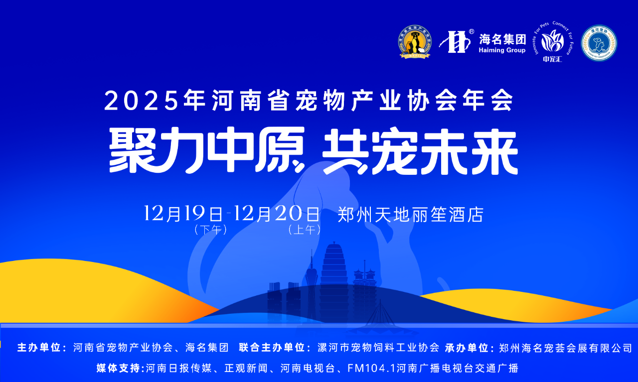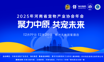12月19日至20日,由河南省寵物產業協會與海名集團聯合主辦,以“聚力中原 共寵未來”為主題的2025年河南省寵物產業協會年會將在鄭州舉行。