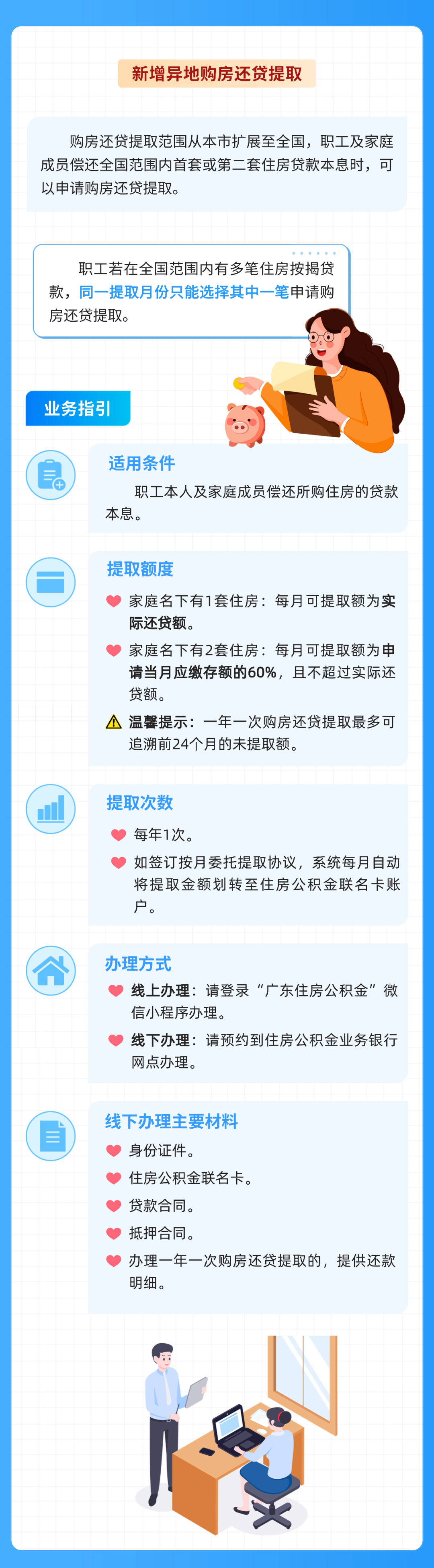 提取新規(guī)將購房還貸提取支持范圍從本市擴展至全國,職工及家庭成員償還全國范圍內(nèi)首套或第二套住房貸款本息時,可以申請購房還貸提取。